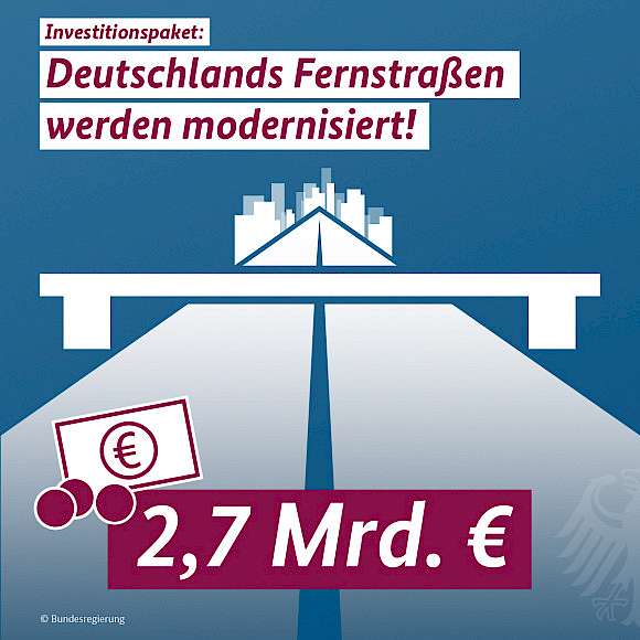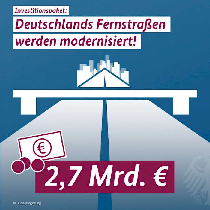 Veranschlagt sind Ausgaben in Höhe von 1,5 Milliarden Euro für Lückenschlüsse bei Autobahnen und Bundesstraßen, 700 Millionen Euro für Neubauprojekte und 500 Millionen Euro für Modernisierungen. Zusätzlich erhöht der Bund die Mittel für das bestehende Brückensanierungsprogramm von 1 auf 1,5 Milliarden Euro.