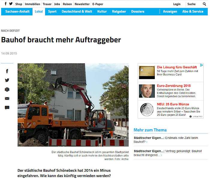 Wie die Zeitung "Die Volksstimme" berichtet, hat der Bauhof von Schönebeck ein Minus von 46.000 € aus dem Haushaltsjahr 2014. Doch Werner Herrler, der Leiter des Bauhofes, hat einen Plan, wie er weitere Ausstände vermeiden möchte: Sein Zauberwort heißt interkommunale Zusammenarbeit.