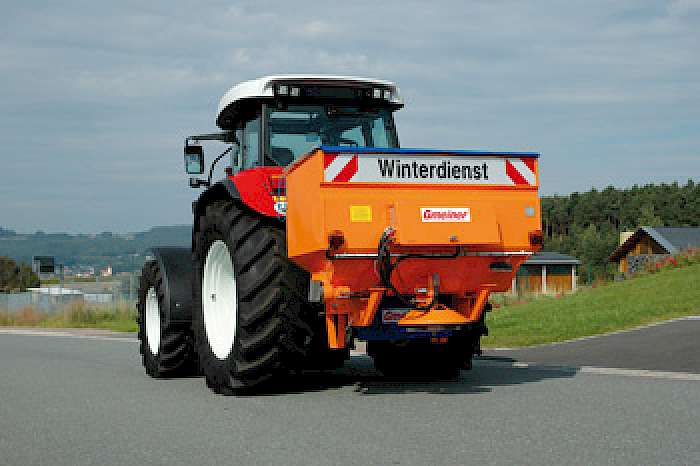 Der Hersteller Gmeiner hat technische Neuerungen in seine Streuautomaten für Fahrzeuge mit Dreipunkt-Hydraulik eingebaut und der gesamten Baureihe einen neuen Namen gegeben. Tracon heißt nun die Serie seiner Trockenstoff-, Feuchtsalz- und Selbstladestreuer für Traktoren. Die Baureihe umfasst mehrere Trockenstoffstreuer in drei Behältergrößen von 1,0, 1,5 und 1,8 m3 (als Einkammer und Doppelkammer-Streuautomaten lieferbar) sowie einen Feuchtsalzstreuer mit einem Behältervolumen von 1,2 m3 Trockenstoff und 450 Litern Flüssigsalz. Ergänzt wird die Serie durch die Selbstlade-Streuer der Baureihe Tracon S. Streubehälter mit neuen DimensionenWesentliche Vorteile bringen die neuen Streuer laut Hersteller schon beim Beladen durch ihre mehr als 20 Prozent breiteren und niedrigeren Behälter. Die auf nunmehr 2000 mm verbreiterten Behälter erleichtern die Ladevorgänge, ihr niedriger Schwerpunkt soll zudem das Fahrverhalten der Fahrzeug-Geräte-Kombination im Streueinsatz verbessern. Neben den Behälterdimensionen wurden auch der Geräteraum überarbeitet und die Abstellfüße neu angeordnet. Sie befinden sich jetzt immer am Gerät, ohne das Streubild zu beeinflussen. Zum Abstellen des Streugerätes werden die Füße um 180° gedreht. Eine weitere Änderung betrifft das seitliche Kettengetriebe. Es wurde nach innen versetzt und steht jetzt immer innerhalb der Behälterbreite. Dadurch soll die Antriebseinheit besser geschützt sein. Selbstladestreuer zum einfachen BeladenDie Selbstlade-Streuautomaten Tracon S für Fahrzeuge mit Dreipunkt-Hydraulik sind in Behältergrößen von 1,0 und 2,4 m3 lieferbar und können laut Gmeiner an alle gängigen Traktoren angebaut werden. Wesentliche Vorteile sollen diese Streuer beim Beladen bieten: Hierzu wird der Streuautomat um 90° nach hinten und unten geschwenkt. In dieser Position kann der Fahrer rückwärts in das Streugut einfahren und dadurch den Behälter befüllen. Danach wirdder Behälter hydraulisch in seine Ausgangslage zurückgeschwenkt.