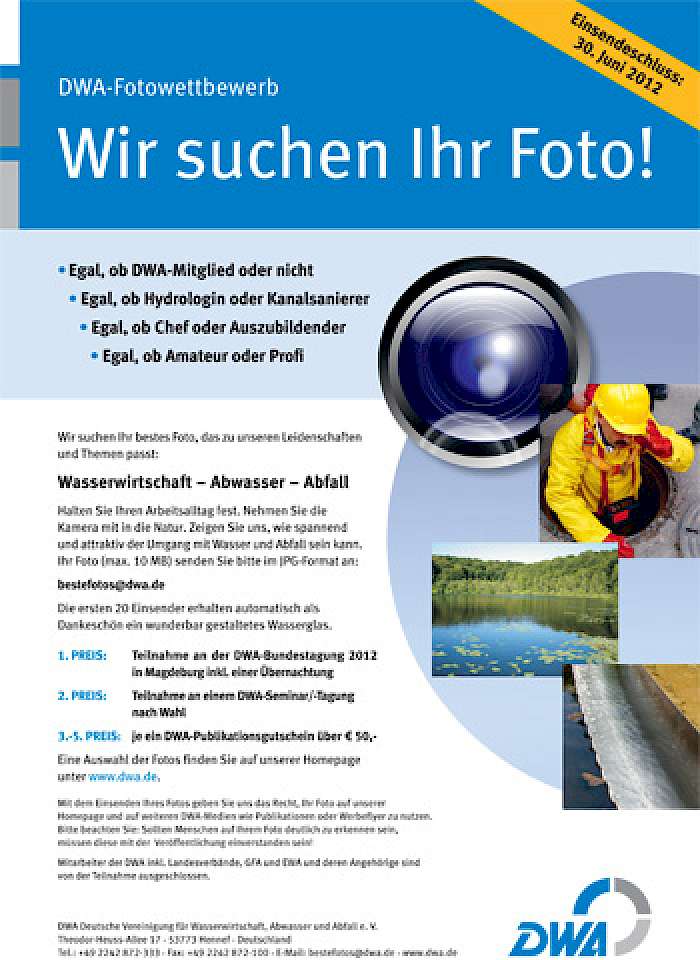 Interessierte können ihr Foto mit einem maximalen Dateivolumen von 10 MB im JPG-Format an bestefotos@dwa.de senden. Die ersten 20 Einsender erhalten ein DWA-Wasserglas als Dankeschön. Einsendeschluss ist der 30. Juni 2012.
