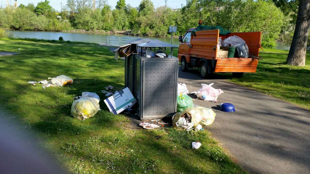 Doch das Müllproblem war bislang nicht in den Griff zu bekommen und das Aufkommen ist stetig gewachsen. Waren es vor sieben Jahren noch ca. 80 – 90 t Müll pro Jahr, fallen nun im Schnitt 110 t Restmüll auf den Grünflächen an. Dieser wird zunächst auf den Pritschen zusammengetragen und auf dem Gelände des Gartenamts in großen Absetzmulden gesammelt. Wenn diese voll sind, werden sie im Heizkraftwerk, wie anderer Restmüll, verbrannt. Die Glasflaschen versuchen die Mitarbeiter zuvor zu entfernen und entsorgen diese über Altglascontainer.