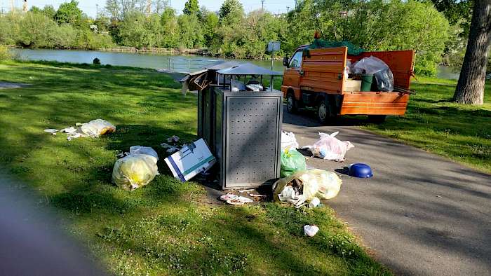 Zügig und Hand in Hand geht die Arbeit voran. Neue Beutel werden in die Eimer eingehängt und zurück in die Vorrichtung geschoben. Danach setzen wir die Fahrt fort und Anja Schlereth erklärt: „Unsere Arbeit beginnt morgens meist am Mainufer. Dort sammeln wir an den entsprechenden Tagen den Unrat ein. Leider nimmt das häufig so viel Zeit in Anspruch, dass wir kaum zu unseren anderen Aufgaben kommen. Wir kümmern uns natürlich auch noch um die Pflege der Grünflächen: Mähen, das Kontrollieren die Bäume oder Bepflanzen die Beete.“