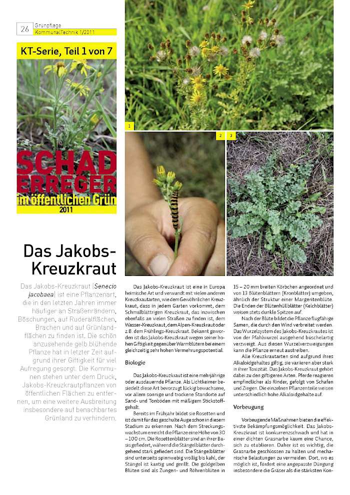 Das Jakobs-Kreuzkraut (Senecio jacobaea) ist eine Pflanzenart, die in den letzten Jahren immer häufiger an Straßenrändern, Böschungen, auf Ruderalflächen, Brachen und auf Grünlandflächen zu finden ist. Die schön anzusehende gelb blühende Pflanze hat in letzter Zeit aufgrund ihrer Giftigkeit für viel Aufregung gesorgt. Die Kommunen stehen unter dem Druck, Jakobs-Kreuzkrautpflanzen von öffentlichen Flächen zu entfernen, um eine weitere Ausbreitung insbesondere auf benachbartes Grünland zu verhindern.