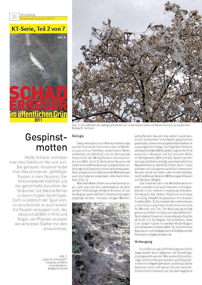 Weiße Schleier umhüllen manches Gehölz im Mai und Juni. Bei genauem Hinsehen findet man Massen kleiner, gefräßiger Raupen in dem Gespinst. Der fortschreitende Kahlfraß und das geisterhafte Aussehen der Sträucher und Bäume führen zu beunruhigten Nachfragen. Doch so plötzlich der Spuk kam, so verschwindet er auch wieder. Die Raupen verpuppen sich, das Gespinst zerfällt in Wind und Regen, die Pflanzen ersetzen die verlorenen Blätter mit dem Johannistrieb.