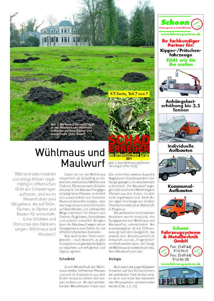 Während viele Insekten und einige Milben regelmäßig im öffentlichen Grün als Schaderreger auftreten, sind es im Wesentlichen zwei Säugetiere, die auf Grünflächen, in Gärten und Beeten für wirtschaftliche Schäden und Unmut bei den Gärtnern sorgen: Wühlmaus und Maulwurf.