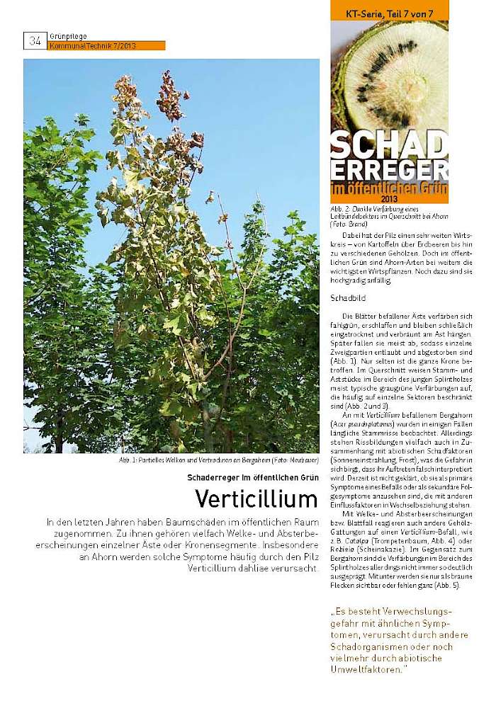 In den letzten Jahren haben Baumschäden im öffentlichen Raum zugenommen. Zu ihnen gehören vielfach Welke- und Absterbeerscheinungen einzelner Äste oder Kronensegmente. Insbesondere an Ahorn werden solche Symptome häufig durch den Pilz Verticillium dahliae verursacht.