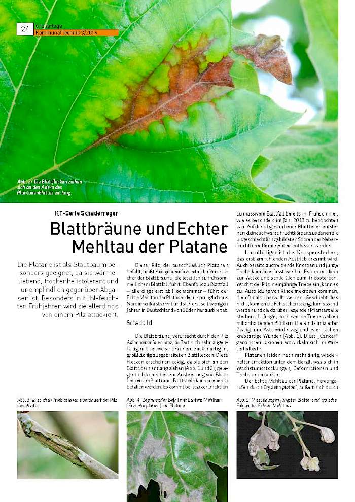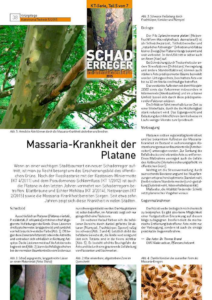 Wenn an einer wichtigen Stadtbaumart ein neuer Schaderreger auftritt, ist man zu Recht besorgt um das Erscheinungsbild des öffentlichen Grüns. Nach der Rosskastanie mit der Kastanien-Miniermotte (KT 4/2011) und dem Pseudomonas-Schleimfluss (KT 1/2012) ist auch die Platane in den letzten Jahren vermehrt von Schaderregern betroffen: Blattbräune und Echter Mehltau (KT 3/2014), Netzwanzen (KT 2/2015) sowie die Massaria-Krankheit bereiten Sorgen. Seit etwa zehn Jahren zeigt sich diese Krankheit in vielen Städten.