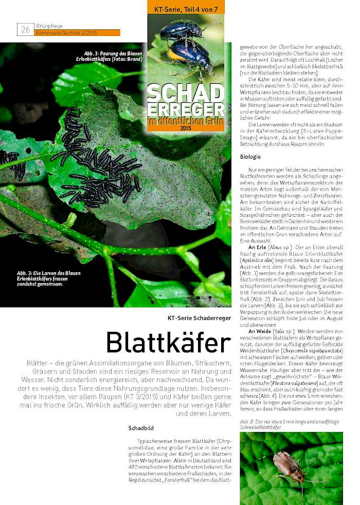 Blätter – die grünen Assimilationsorgane von Bäumen, Sträuchern, Gräsern und Stauden sind ein riesiges Reservoir an Nahrung und Wasser. Nicht sonderlich energiereich, aber nachwachsend. Da wundert es wenig, dass Tiere diese Nahrungsgrundlage nutzen. Insbesondere Insekten, vor allem Raupen (KT 3/2015) und Käfer beißen gerne mal ins frische Grün. Wirklich auffällig werden aber nur wenige Käfer und deren Larven.