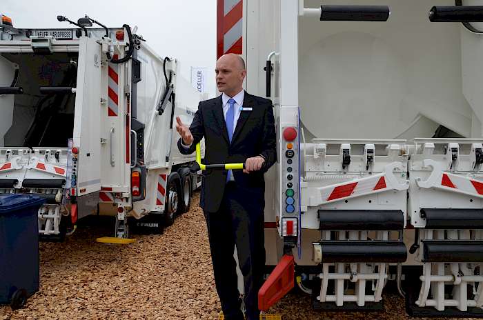 Als Weltneuheit bezeichnete Faun im Zuge einer Presseveranstaltung das Rückfahr-Sicherungs-System (RSS) zum Schutz des Bedienpersonals bei der Mitfahrt auf Trittbrettern von Entsorgungsfahrzeugen.