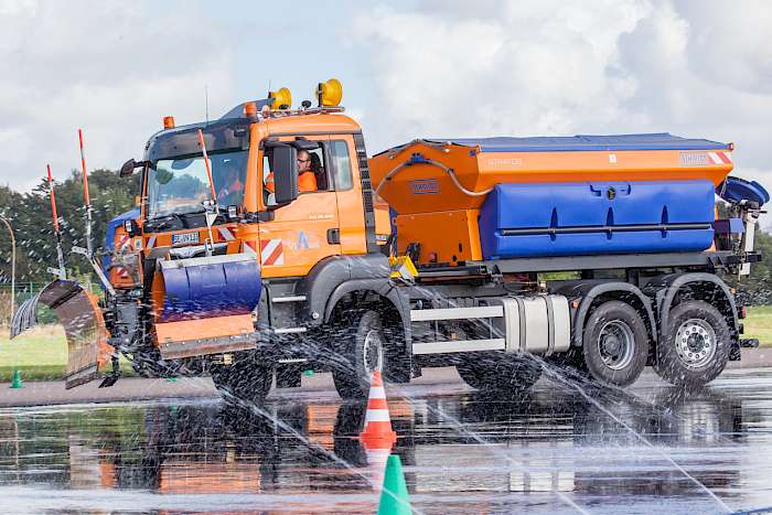 Die Straßenwärter der Via Solutions Nord Service sind für den reibungslosen Betrieb auf der A7 zwischen dem Autobahndreieck HH-Nordwest und der Anschlussstelle Neumünster-Nord verantwortlich. Geübt wurde der Einsatz des Wintergeräts auf trockener und glatter Fahrbahn. Neben Brems- und Ausweichmanövern ging es dem VIN Fahrtrainer Michael Breitling vom Verkehrsinstitut Nord, um das sichere Handling der Räumfahrzeuge in engen Kurven und sonstigen Engpassstellen. Die Mitarbeiter der Straßenmeisterei A7 Hamburg - Neumünster bekamen durch die unterschiedlichen Übungsstationen ein Gefühl für die Abmessungen und das Fahrverhalten der MAN Fahrzeuge und des Mercedes Unimog. Ein Theorieteil zu Beginn und ein Feedbackgespräch nach der Praxis rundeten das Fahrsicherheitsprogramm im Fahrtrainingszentrum am „Hungrigen Wolf“ in Schleswig-Holstein ab. Der Winter an der A7 kann kommen.