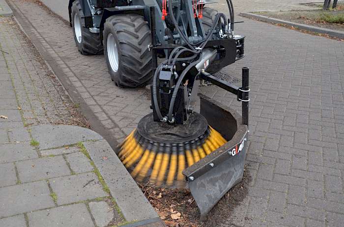 Neben der Hydraulikfunktion für die Bürstenrotation gibt es einen zweiten Hydraulikanschluss am Hubarm, der für die Schrägstellung des kompletten Arms benötigt wird. Dadurch hat die Bürste eine Reichweite von 2,20 m. Die Wildkrautbürste ist serienmäßig mit einem Spritzschutz ausgestattet.
