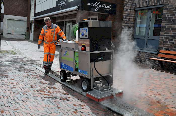 Seit 2019 arbeitet der Dinklager Bauhof in der Wildkrautbeseitigung mit einem handgeführten Heißdampferzeuger von Stadiko. Zuvor wurde das unerwünschte Grün vor allem händisch mithilfe von Freischneidern bearbeitet. Bauhofleiter Helmut Schwarte berichtet: „Das ist aber sehr arbeitsintensiv. Die Geräte verschleißen schnell, und es ist aus Sicherheitsaspekten in stark von Fußgängern frequentierten Bereichen nicht die optimale Lösung.“