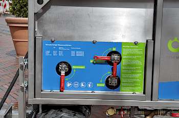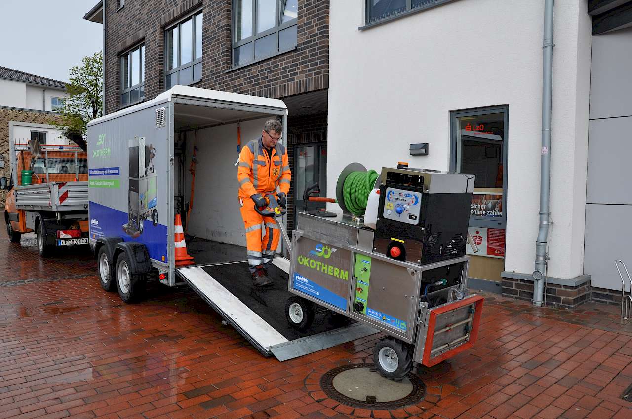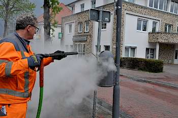 Der Stadiko Heißdampferzeuger Ökotherm arbeitet mit bis zu 130 °C heißem Wasser-/Wasserdampfgemisch, dem lediglich etwas Wasserenthärter zugefügt wird. Der Wasserdampf hat die Aufgabe, die Oberfläche anzuwärmen, damit das im gleichen Arbeitsgang ausgebrachte heiße Wasser ohne Temperaturverluste an die im Boden befindlichen Wurzeln gelangt. Durch diesen Vorgang wird in der Pflanze ein Eiweißschock ausgelöst, der die Zellwand der Pflanze nachhaltig zerstört. Die Pflanze soll nun kein Wasser mehr aufnehmen und vertrocknet. Der soeben behandelte Löwenzahn rund um ein Straßenschild erinnert etwas an gedünsteten Spinat, fällt aber nach ein bis zwei Tagen in sich zusammen und verrottet, so Martin Schwermann. Sehr gut bestockte Grasbestände seien am schwierigsten zu behandeln, denen müsse man öfter zu Leibe rücken oder auch mal händisch nachhelfen. „Da muss dann unter Umständen im Vorfeld nochmal ein Freischneider ran, so dass die Pflanze nicht mehr so viel Grün besitzt und das Heißwasser direkt an der Wurzel wirken kann“, ergänzt Helmut Schwarte. „100 °C heiß sollte das Wasser bei Benetzung sein, um eine gute Wirkung zu erzielen“, erklärt Mitarbeiter Martin Schwermann.