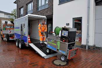 Das Wetter ist nicht optimal, als ich mich auf den Weg ins niedersächsische Dinklage mache. Dort will ich mir die Wildkrautbeseitigung mittels Heißwasser/-dampf anschauen. Doch Petrus hat Gnade mit mir und lässt die Sonne nach einem kurzen Regenschauer doch noch herauskommen, so dass mir Bauhofmitarbeiter Martin Schwermann die Wildkrautkämpfung rund um das Dinklager Rathaus zeigen und erklären kann. Weitere Fragen kläre ich später corona-konform mit Bauhofleiter Helmut Schwarte am Telefon.