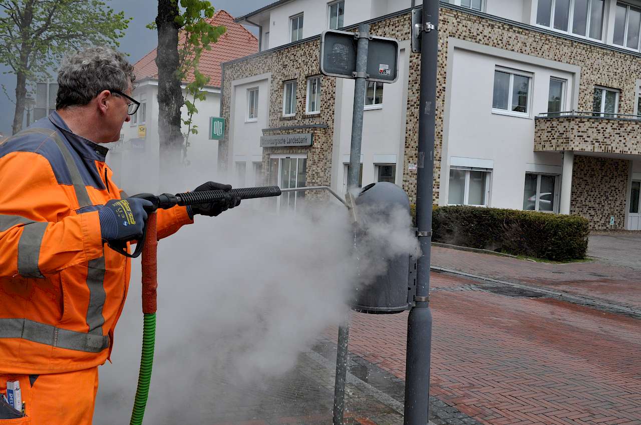 Vorab: die Innenstadt macht auf mich Anfang Mai einen sehr gepflegten Eindruck. Das mag daran liegen, dass der Frühling hier oben im Norden in diesem Jahr bisher kühl und wenig wüchsig ist, oder es wird von Seiten der Stadtverwaltung viel Wert auf ein ordentliches Erscheinungsbild gelegt. „Publikumswirksame Flächen, wie hier rund um das Rathaus und den Marktplatz oder auch Bushaltestellen, bearbeiten wir bis zu viermal pro Jahr mit dem Heißwassergerät. Ich kann aber feststellen, dass das Unkraut an einigen Stellen schon weniger wird. Dadurch, dass es nicht mehr zum Blühen kommt, gibt es kein neues Samenpotential und die Pflanzen werden auf Dauer ausgehungert“, berichtet Martin Schwermann. Er teilt sich diese Aufgabe mit einem Kollegen.